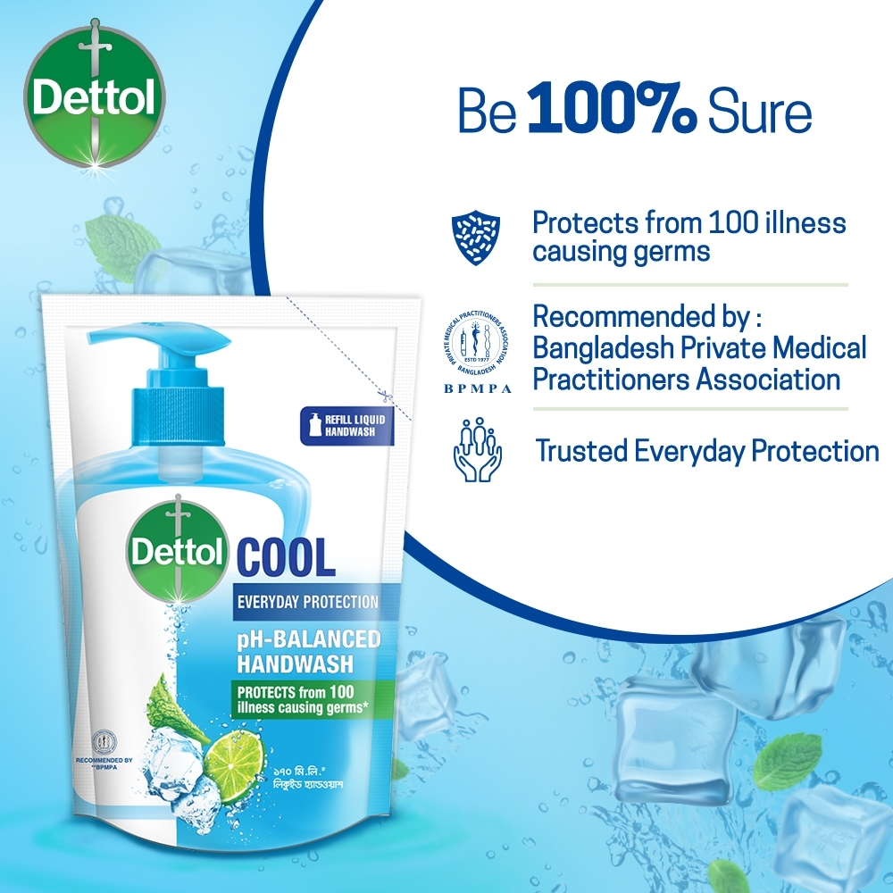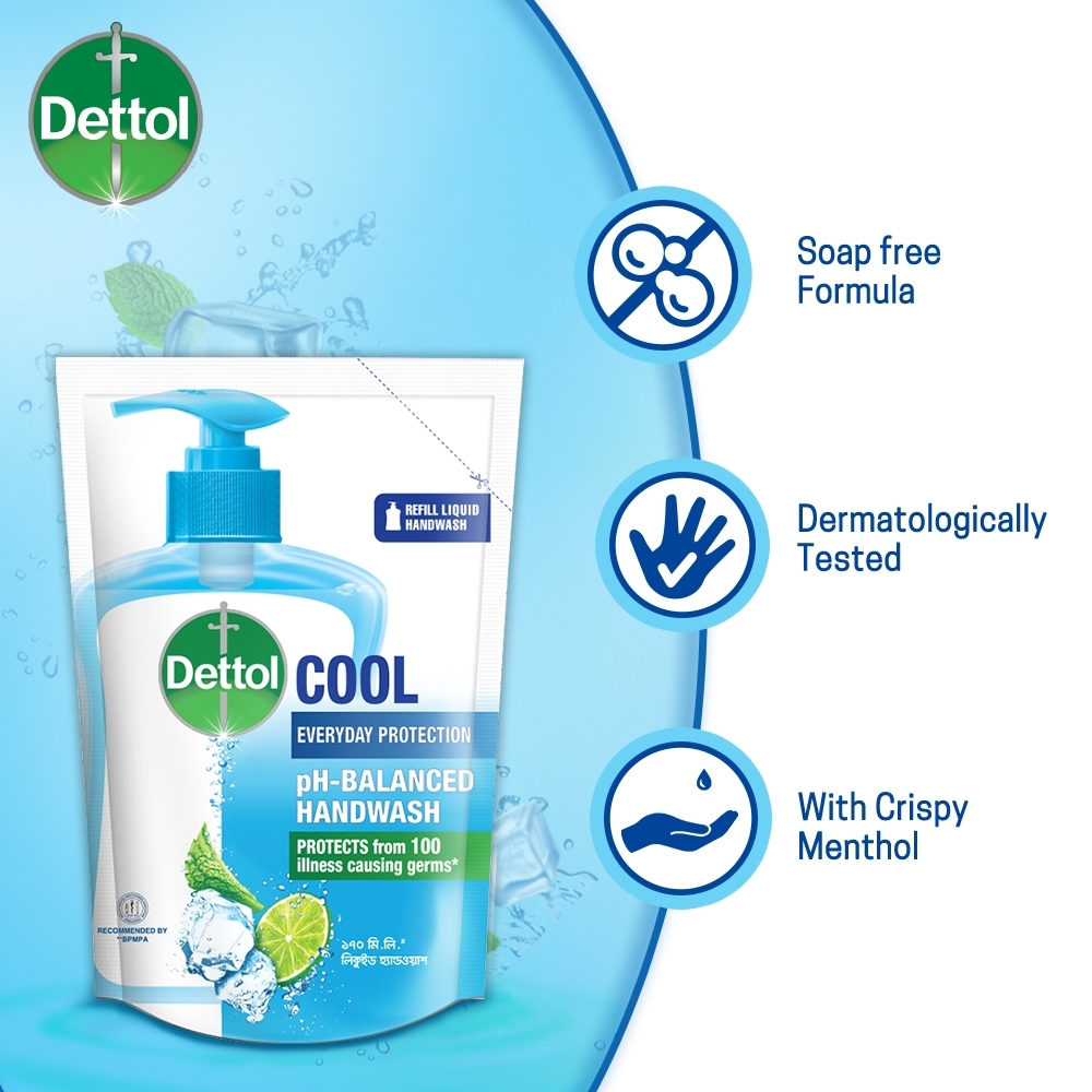 Dettol Handwash Cool 170ml Refill, pH-Balanced Liquid Soap with Menthol